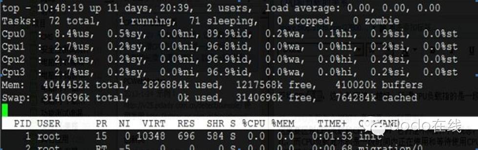 但是每个内核的负载为1,并不能算是一种理想状态!这意味着我们的CPU一直很忙,不得清闲。网上有说理想的状态是每个内核的负载为0.7左右,我比较赞同,0.7乘以内核数,得出服务器理想的CPU负载,比如我这台服务器,负载在3.0以下就可以。
