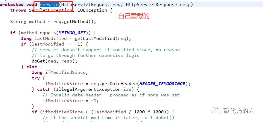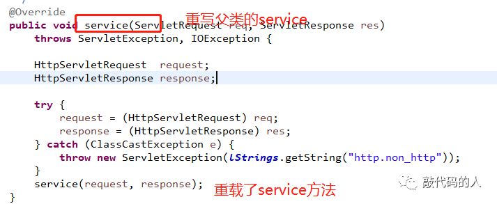 当一个请求过来时,会执行servlet中service方法,根据多态,,会执行子类中service方法,会把请求转换为http形式的,在执行自己的重载方法