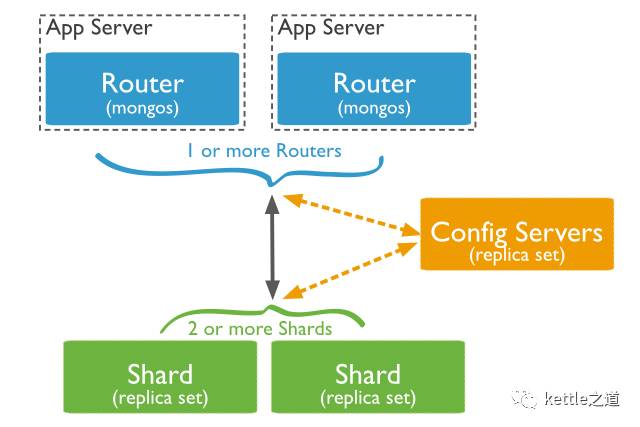 config servers:配置服务器存储分片元数据、集群配置:collection的数据块、每个数据块包含的document范围、每个数据块存储在哪个分片上等