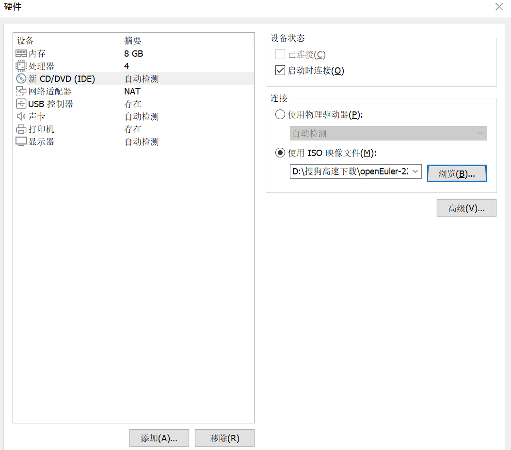 选择“使用ISO镜像文件”,把最上面说的下载好的系统镜像文件添加上