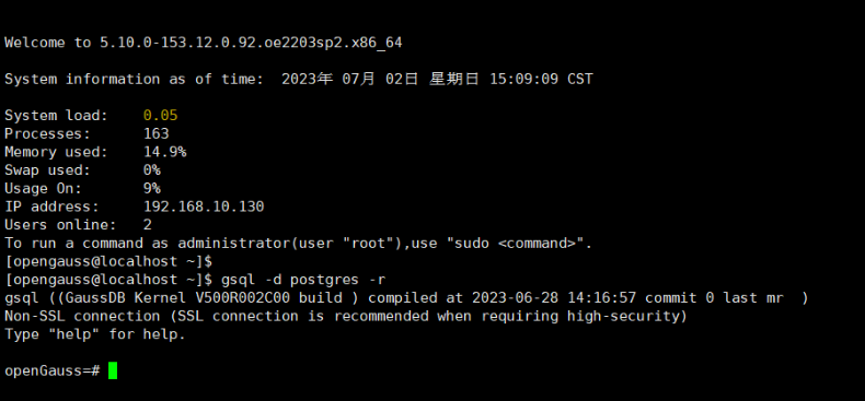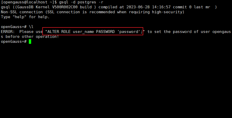 显示已经有的db: openGauss=# \l 提示需要先进行密码的修改