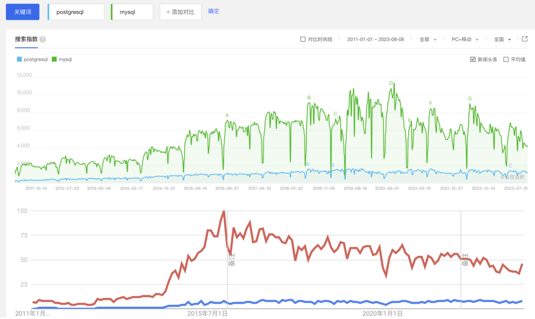 搜索引擎热搜数据具有很大局限性:首先:无法区分用户搜索的目的究竟是因为喜爱支持,还是遇到了糟心的问题需要解决,其次,MySQL 在 SEO 上天生相比 PostgreSQL 占据优势: PostgreSQL 至少具有5种名称变体:pg, psql, pgsql, postgres, postgresql 。