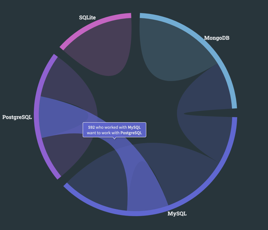 在 “Worked with 与 want to work” 一项中,我们还可以看出对于菜鸟来说,唯一的显著的数据库间流动正是:从 MySQL 到 PostgreSQL 的。