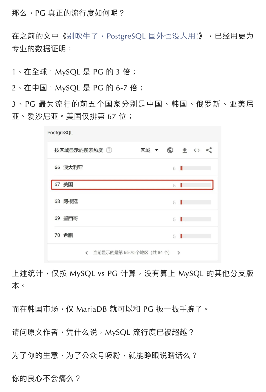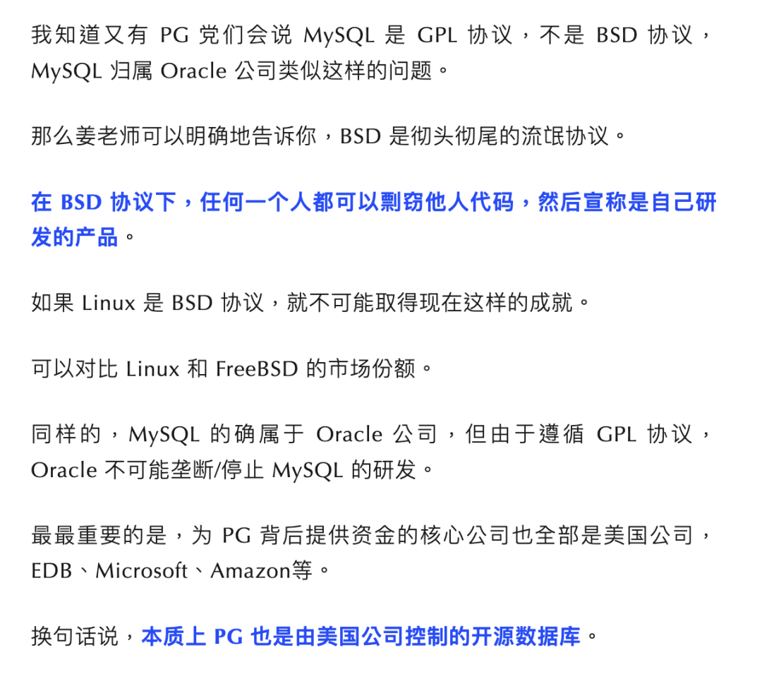 作者最后对 BSD 协议开炮,认为 BSD 协议是流氓协议,而且本质上 PG 也 是由美国公司控制的开源数据库。