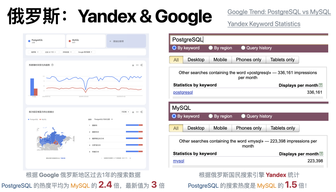 美国的搜索热度,PostgreSQL:MySQL 为 70:64,而受到制裁的俄罗斯则更为显著:PostgreSQL:MySQL 达到了3:1。俄罗斯国民搜索引擎的数据,也基本反映了这一点,PostgreSQL:MySQL 热度为 3:2。