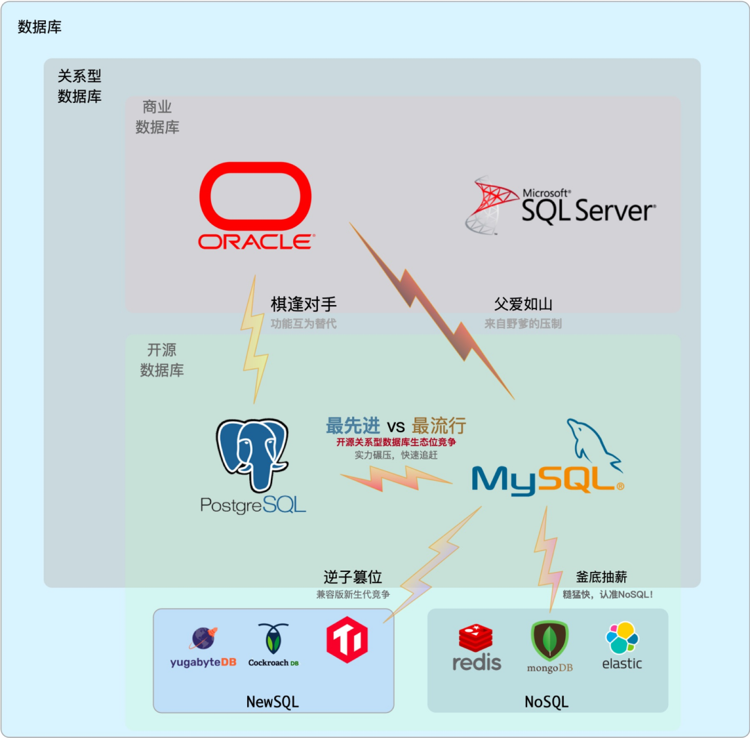 毕竟,MySQL 树大招风:前有狼后有虎,上有野爹下有逆子:在严谨的事务处理和数据分析上,MySQL被同为开源关系型数据库的PgSQL甩开几条街;而在糙猛快的敏捷方法论上,MySQL又不如新兴NoSQL。同时,MySQL上有养父Oracle的压制,中有MariaDB分家,下有诸如TiDB,OB之类的兼容性新数据库分羹。那么,到底是谁起了主要作用呢?