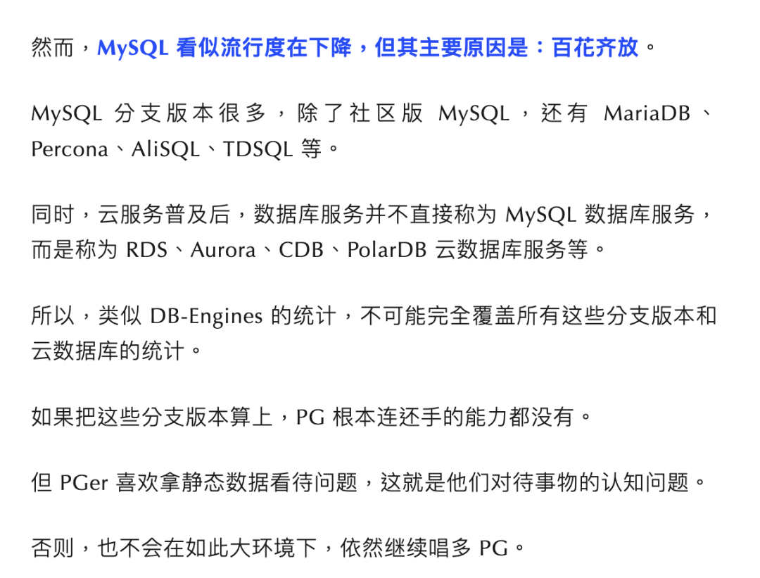 作者能够承认 MySQL 的流行度是在下降,这是不错的,但究竟是转去 PG ,还是其他数据库了呢?