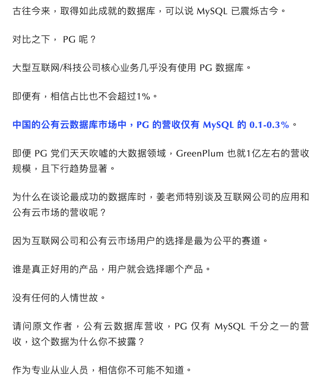 作者认为,在中国公有云数据库市场中 PG 的营收仅有 MySQL 的 0.1% ~ 0.3% 。我很好奇作者的数据来源是什么。因为根据 AWS RDS 团队给出的数据,他们 PostgreSQL 与 MySQL 的实例数量目前是 1:1 ,考虑到 MySQL 小型实例偏多,PostgreSQL 在营收上还占点优势。