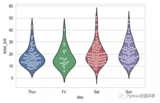 还有一点比较好的是,可以将 swarmplot(),violinplot(),或 boxplot() 混合使用,这样可以结合多种绘图的特点展示更完美的效果。