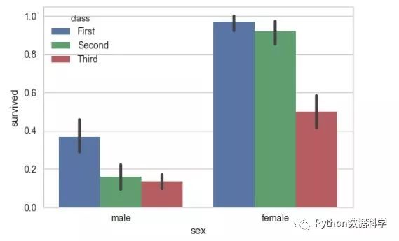 我们最熟悉的方式就是使用一个条形图。 在Seaborn中 barplot() 函数会在整个数据集上显示估计,默认情况下使用均值进行估计。 当在每个类别中有多个类别时(使用了 hue),它可以使用引导来计算估计的置信区间,并使用误差条来表示置信区间: