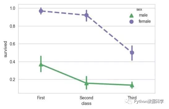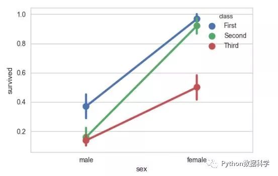 pointplot() 函数提供了估计可视化的另一种风格。该函数会用高度估计值对数据进行描述,而不是显示一个完整的条形,它只绘制点估计和置信区间。另外,点图连接相同hue类别的点,比如male中的蓝色会连接female中的蓝色。这使得很容易看出主要关系如何随着第二个变量的变化而变化,因为你的眼睛可以很好地辨别斜率的差异: