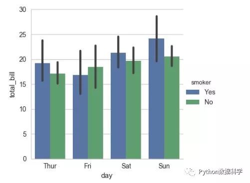 在这基础上,也可以通过 hue 参数加入另一个嵌套的分类变量,而且嵌套的分类变量可以以不同的颜色区别,十分方便。
