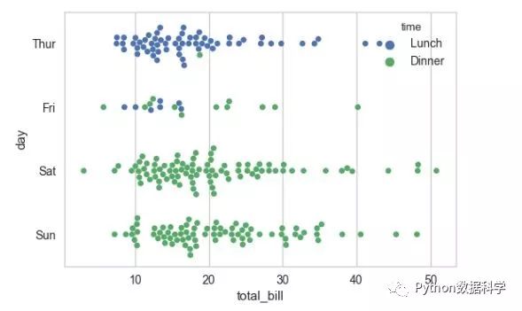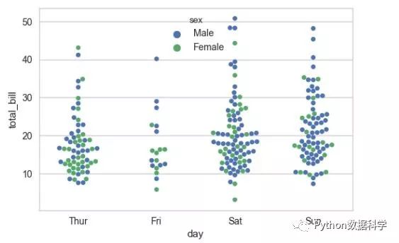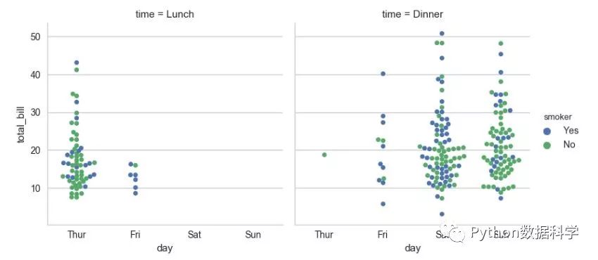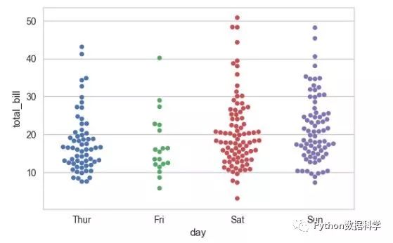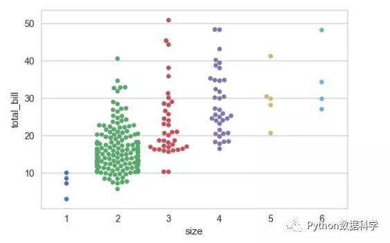 当然,还有一个不同的方法就是使用 swarmplot() 函数,这个函数的好处就是所有的点都不会重叠,这样可以很清晰的观察到数据的分布。