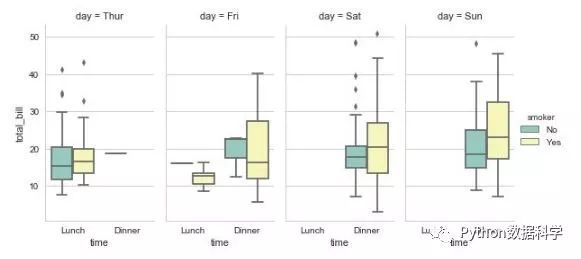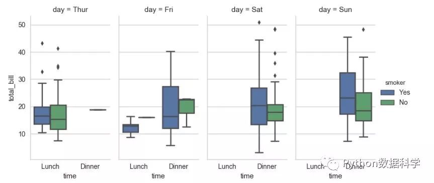 你也可以直接使用 boxplot() 和 FacetGrid 来制作这个图。但是,必须特别注意确保每个图的分类变量的顺序需要被强制,或者是使用具有Categorical数据类型的数据或通过命令和 hue_order。