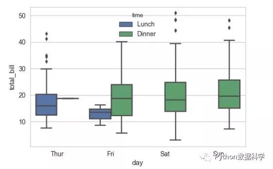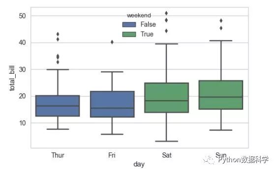 对于箱型图来说,使用 hue 参数的假设是这个变量嵌套在x或者y轴内。所以默认的情况下,hue 变量的不同类型值会保持偏置状态(两类或几类数据共同在x轴数据类型的一个类中),就像上面那个图所示。但是如果 hue 所使用的变量不是嵌套的,那么你可以使用 dodge 参数来禁止这个默认的偏置状态。