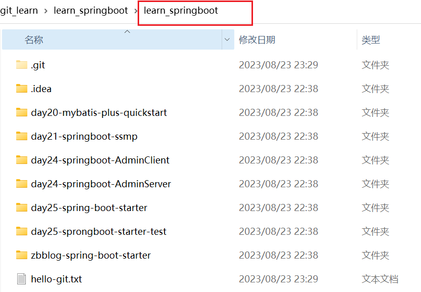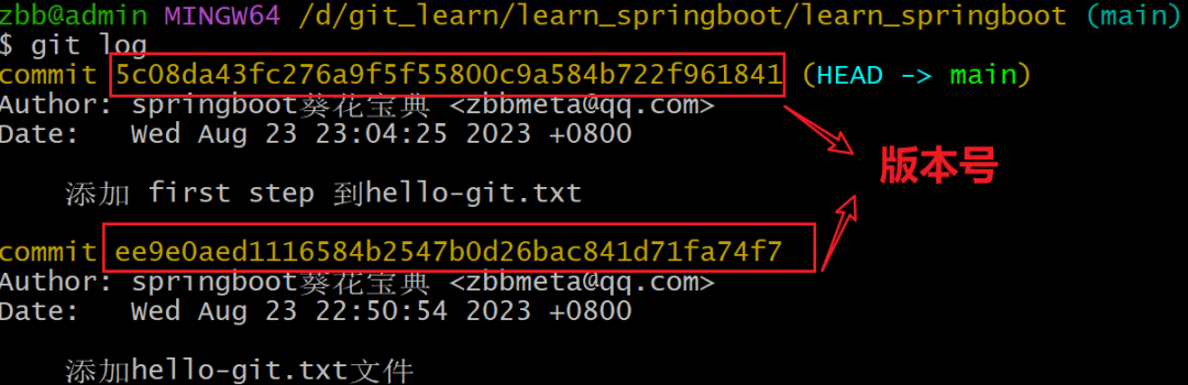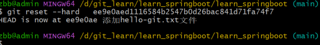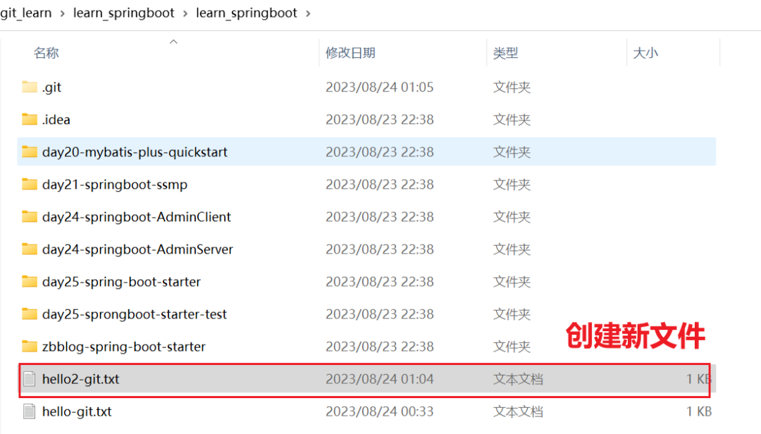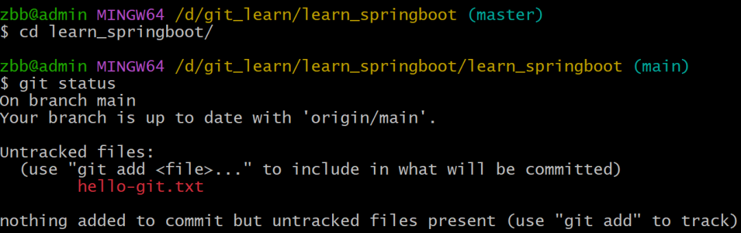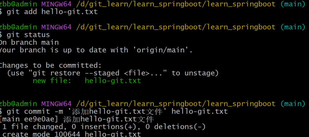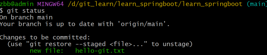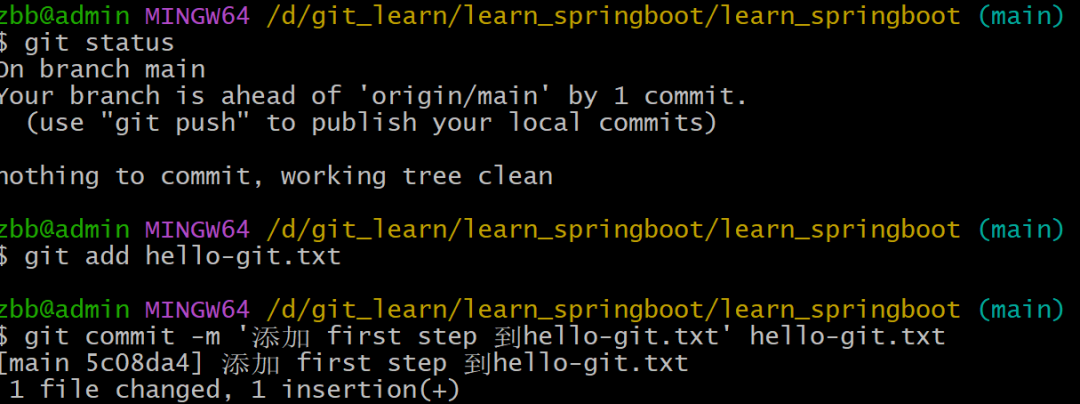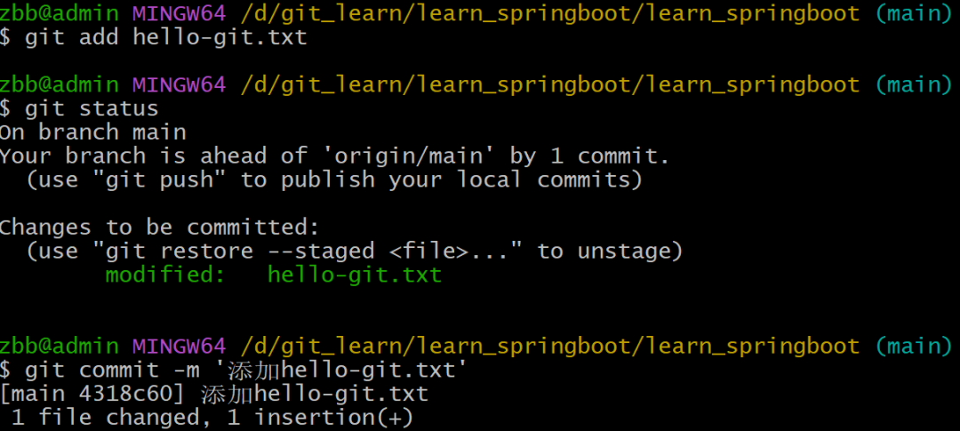 在learn_springboot目录下创建hello-git.txt文件,添加暂存区,提交到本地版本库