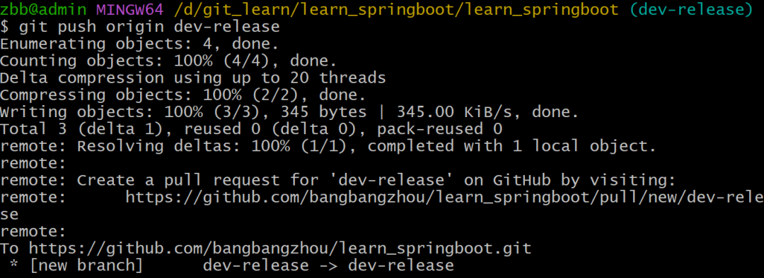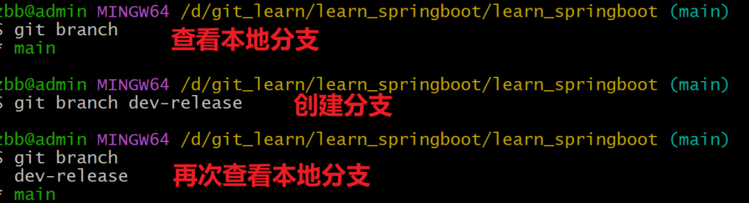 演示:在learn_springboot本地版本库创建dev-release分支如图