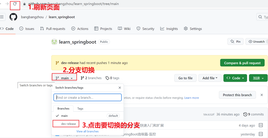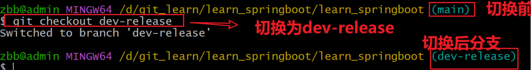 演示:在learn_springboot本地版本库切换操作分支为dev-release分支如图