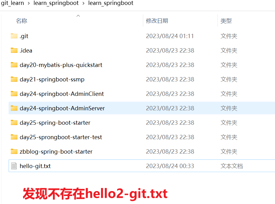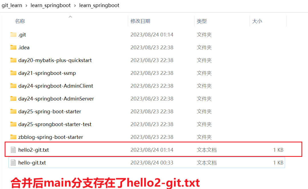 查看合并后的目录资源结构,发现包含合并过来的hello2-git.txt文件