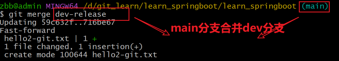 注意:由于dev-release是在main上创建出来的,所以必须由main合并dev-release,不可以dev-release合并main