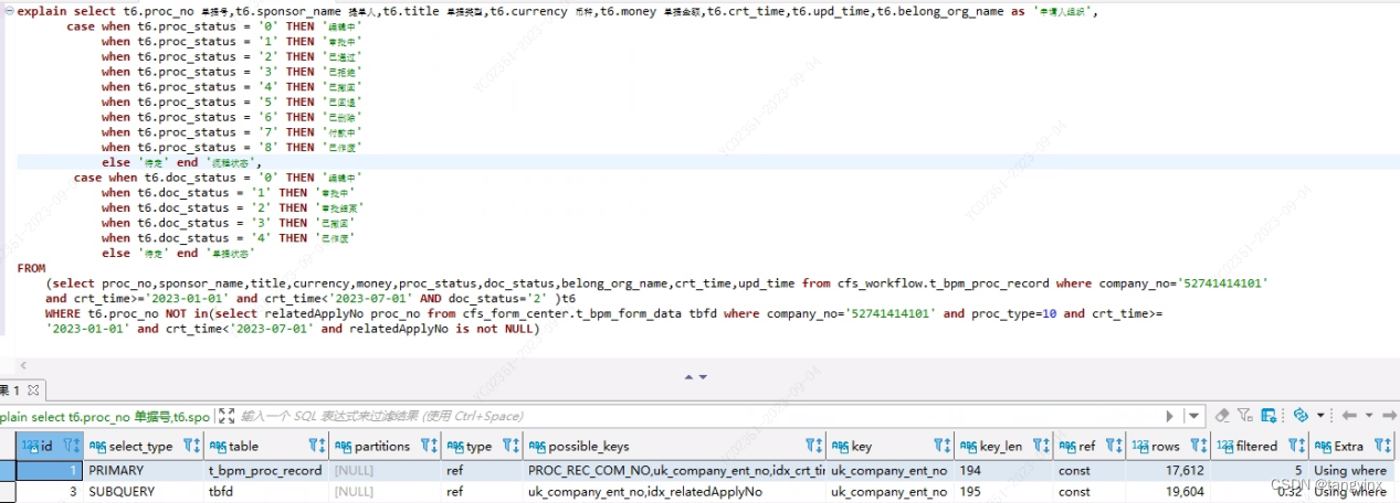 select t6.proc_no 单据号,t6.sponsor_name 提单人,t6.title 单据类型,t6.currency 币种,t6.money 单据金额,t6.crt_time,t6.upd_time,t6.belong_org_name as '申请人组织', case when t6.proc_status = '0' THEN '编辑中' when t6.proc_status = '1' THEN '审批中' when t6.proc_status = '2' THEN '已通过' when t6.proc_status = '3' THEN '已拒绝' when t6.proc_status = '4' THEN '已撤回' when t6.proc_status = '5' THEN '已回退' when t6.proc_status = '6' THEN '已删除' when t6.proc_status = '7' THEN '付款中' when t6.proc_status = '8' THEN '已作废' else '待定' end '流程状态', case when t6.doc_status = '0' THEN '编辑中' when t6.doc_status = '1' THEN '审批中' when t6.doc_status = '2' THEN '审批结束' when t6.doc_status = '3' THEN '已撤回' when t6.doc_status = '4' THEN '已作废' else '待定' end '单据状态' FROM (select proc_no,sponsor_name,title,currency,money,proc_status,doc_status,belong_org_name,crt_time,upd_time from cfs_workflow.t_bpm_proc_record where company_no='52741414101' and crt_time>='2023-01-01' an d crt_time<'2023-07-01' AND doc_status='2' )t6 WHERE t6.proc_no NOT in(select replace(data_json->'$.baseInfo.relatedApplyNo','"','') proc_no from cfs_form_center.t_bpm_form_data tbfd where company_no='52741414101' and proc_type=10 and crt_time>='2023- 01-01' and crt_time<'2023-07-01' and data_json->'$.baseInfo.relatedApplyNo' is not NULL)\G![]()