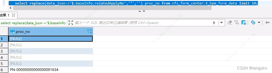 select replace(data_json->'$.baseInfo.relatedApplyNo','"','') proc_no from cfs_form_center.t_bpm_form_data tbfd where company_no='52741414101' and proc_type=10 and crt_time>='2023-01-01' and crt_time<'2023-07-01' and data_json->'$.baseInfo.relatedApplyNo' is not NULL