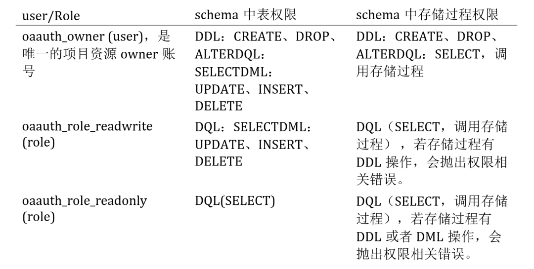 --- schema oaauth的owner是 oaauth_owner账号CREATE SCHEMA oaauth AUTHORIZATION oaauth_owner;--- 授权ROLE相关SCHEMA访问权限。GRANT USAGE ON SCHEMA oaauth TO oaauth_role_readwrite;GRANT USAGE ON SCHEMA oaauth TO oaauth_role_readonly;
