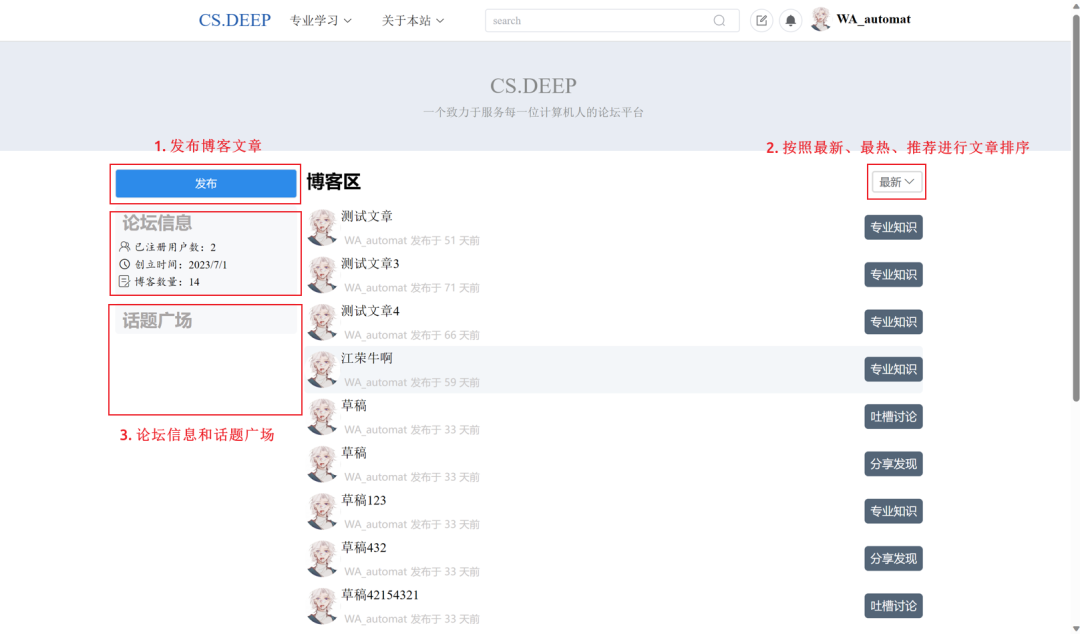 3. 首页主体是论坛文章的展示,我们采用分页展示的方式,除此之外还有按照发布时间、文章热度、推荐等方式进行排列展示。