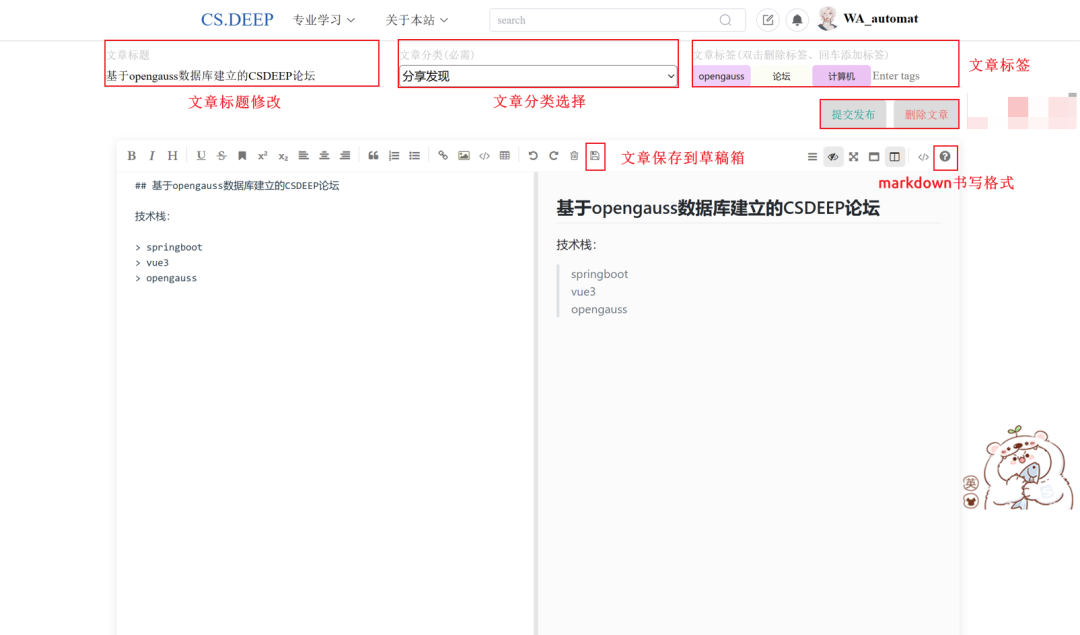 文章编辑页面如下图,主要包括文章标题、文章分类、文章标签、内容主体、文章发布、文章删除几部分内容。