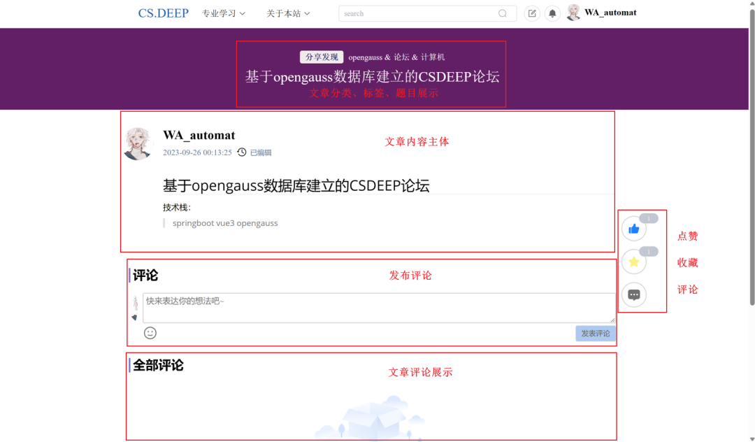 2. 在文章详情页用户可以进行点赞、收藏、评论等功能。