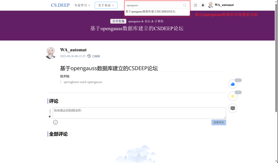 1. 本论坛的搜索采用 openGauss 数据库(tsvector 数据类型与 tsquery函数)实现文章的全局关键字搜索,会根据用户输入的关键词进行实时搜索结果的展现。