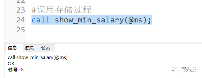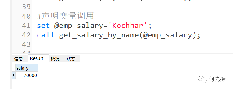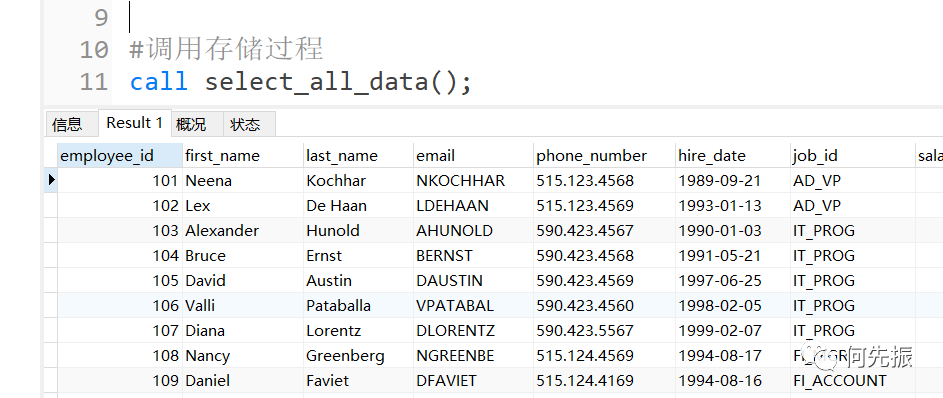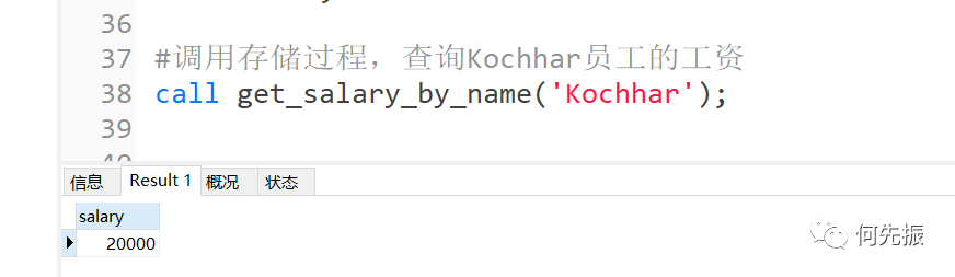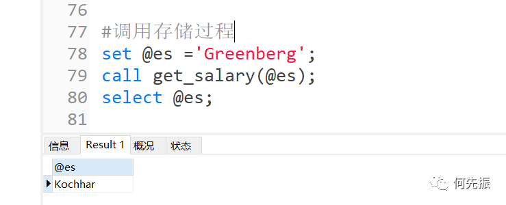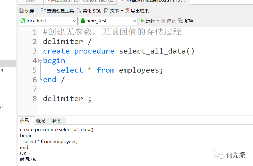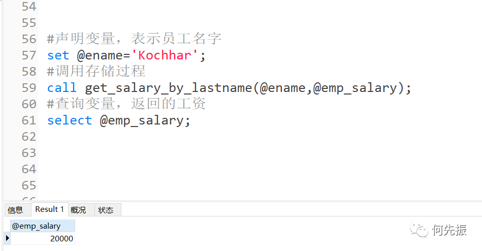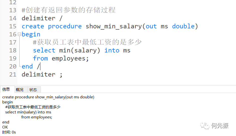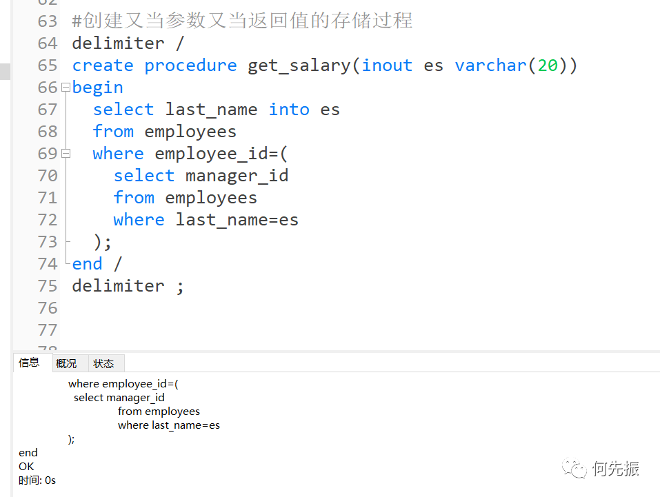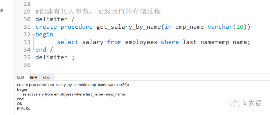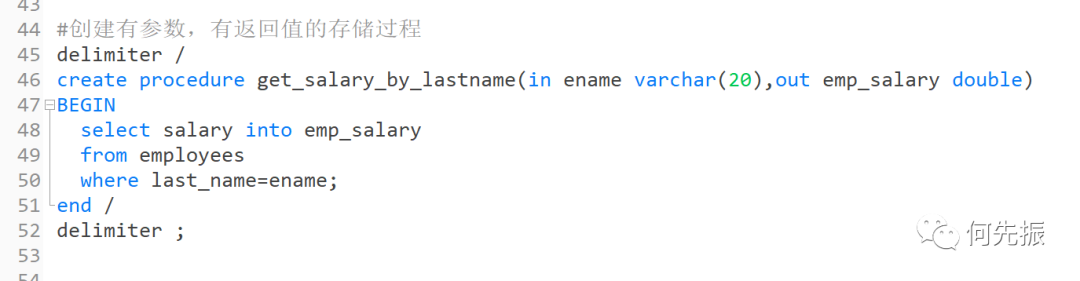 该存储过程查询emp表中的数据。前面的delimiter表示声明结束符号,默认结束符号是;,修改为/,后面又修改回;。