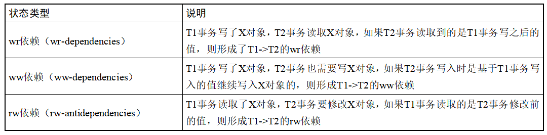 也就是说,在可串行化调度下,事务的执行顺序可以由事务之间读写操作的顺序决定,论文Generalized Isolation Level Definitions中对事务之间的依赖关系做了进一步的分析,如表1所示。