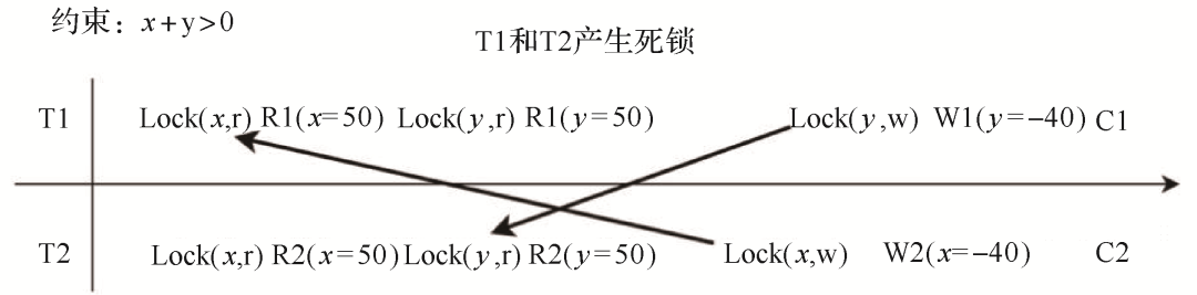 在S2PL下,可以避免写偏序异常。在《PostgreSQL技术内幕:事务处理深度探索》一书的2.1节中介绍过写偏序异常,如果对图2中的两个事务应用S2PL,则会产生死锁。如图2所示,死锁检测机制能保证终止其中一个事务,因此S2PL可以避免写偏序异常。