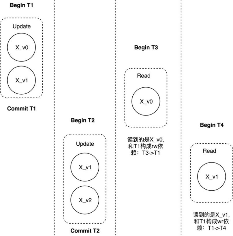 如果T3开始时,T1没有提交,T3读到的是T1更新前的X_v0值,于是形成了T3->T1的rw依赖。