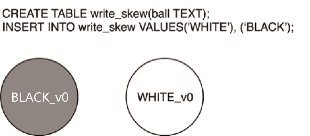 SI存在写偏序异常,可以用一个黑白球问题来解释写偏序异常。假设当前表中有两条元组,一条元组表示黑球,另一条元组表示白球,如图4所示。