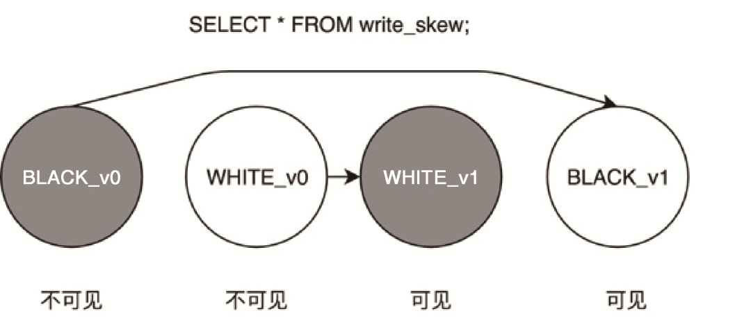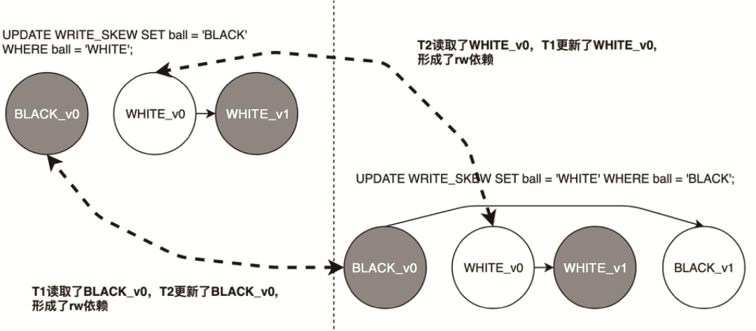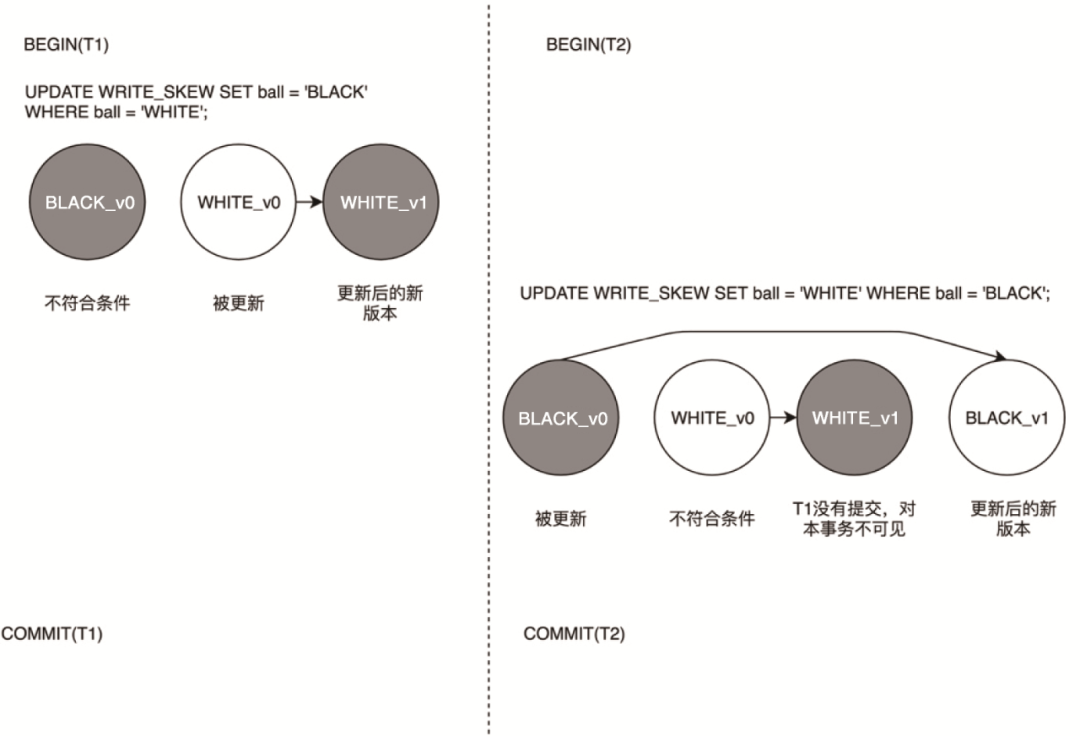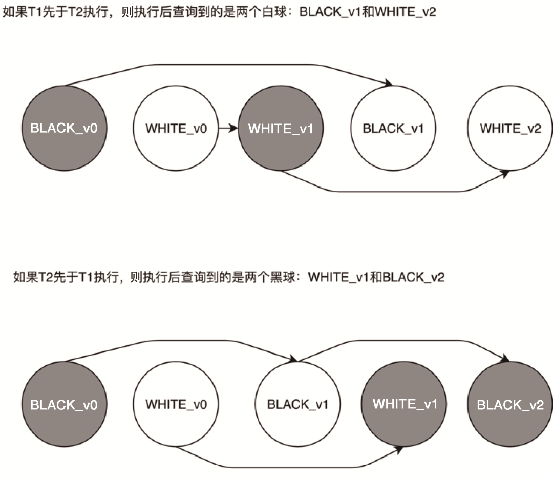 如果有两个并发事务,T1要更新白球为黑球,T2要更新黑球为白球,在MVCC机制下,它们分别都能看到原来v0版本的黑球和白球,但看不到被另一个事务更新后的黑球和白球,如图5所示。