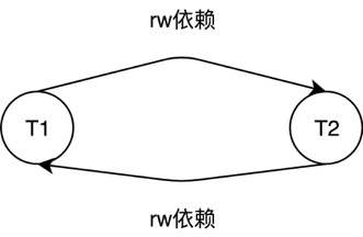 通过分析发现,T1->T2存在rw依赖,T2->T1也存在rw依赖,如图8所示。