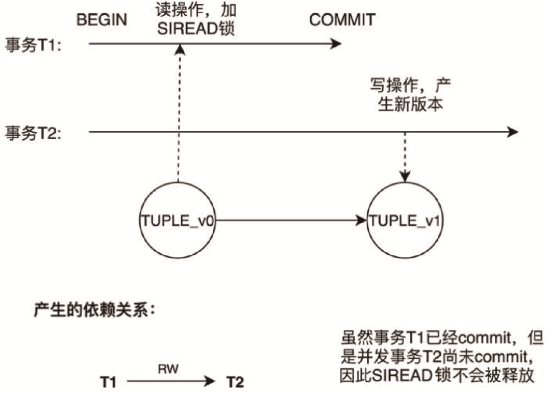 情况二:读操作确实在写操作之前发生也可能会产生rw依赖。例如,在某个事务读取了数据项之后,另一个并发事务对这个数据项做了更新,这种需要借助SIREAD锁来检查rw依赖。SIREAD锁是一种特殊类型的锁,它和数据项上的读写锁不冲突,只是一个记录当前数据项已经被某个事务读取过的标记。当其他事务对数据项做修改(写)操作时,需要对这个数据项加X锁,这时候就可以检查该数据项上是否有SIREAD锁。如果有,就代表发生了rw依赖。需要注意的是,SIREAD锁并不会随着事务结束而释放,而是需要持续到所有的并发事务结束才能释放,如图12所示。