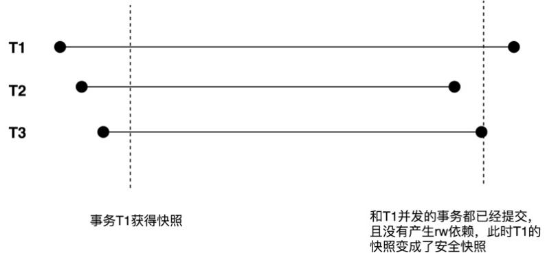 只读事务T1要想构成环,必须要指向一个读写事务T2,而且T1和T2必须是并发事务,假如和只读事务T1并发的事务中都没有产生写操作,也就不可能形成T1->T2的rw依赖,这时候T1中的快照就变成安全快照。如果只读事务中的快照是安全快照,那么就可以释放事务中已经记录的谓词锁,因为这个事务不可能再和其他事务产生rw依赖了。安全快照如图13所示。
