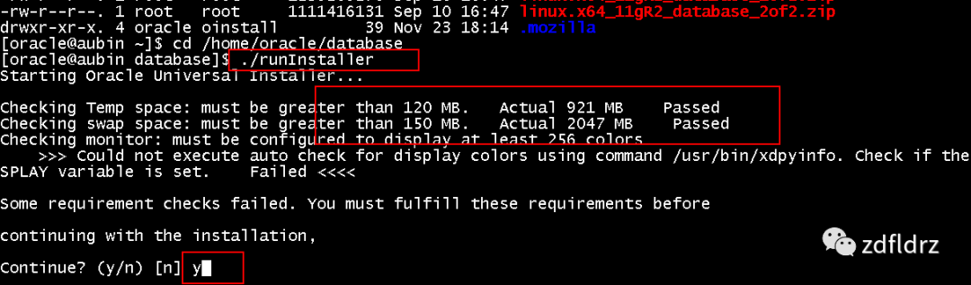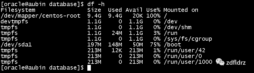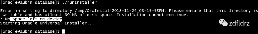 查看:可以看到根目录爆满,然后将/home/oracle目录下的两个oracle安装文件压缩包删除,腾出了部分空间,我次处是使用的vmware搭建的linux系统,最大空间分配太少,只有30G,所以爆满也是情理之中