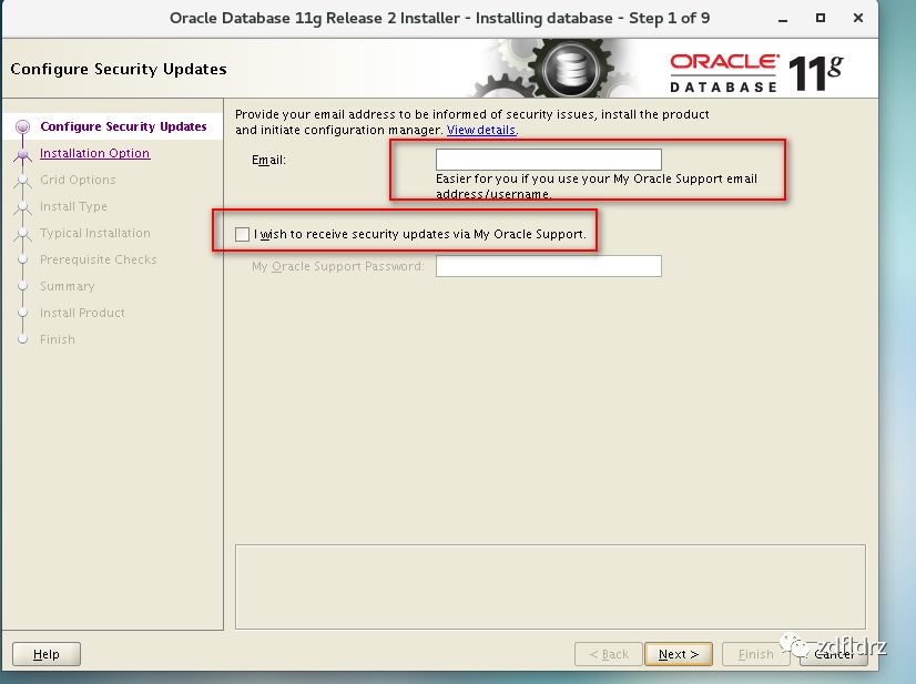 20、去掉I wish to receive security updates via My Oracle Surrport选项,点击Next。