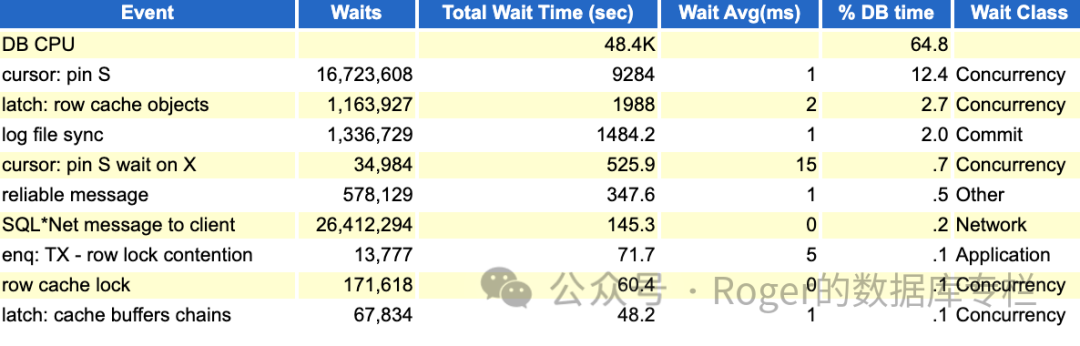 从上面的event来看,高并发带来了一些争用,这一点从event name和Wait Class可以看出来,不做过多解释了,都是一些非常常见的等待事件。说到这里,我在想,国产数据库什么时候才能有这样如此媲美Oracle一样的OWI,让性能诊断变的如此简单。
