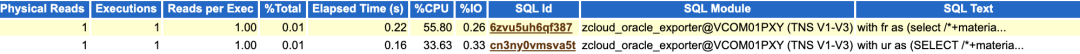 虽然物理读看上去有点高,实际上也还好了,15分钟内仅仅执行了1次,单词执行时间不到0.5s的SQL效率还算Ok了。我进一步看了下这2个SQL都是监控内的,其中一个是监控表空间使用情况的,而且都是经过SQL优化专家调优过的SQL: