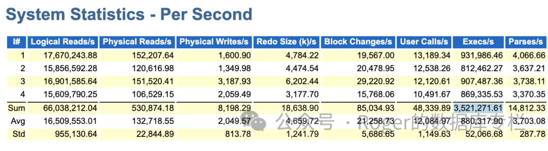 这个用户的数据大家可以看到,实际上更为夸张,4节点RAC每秒SQL执行量之和大概是352万,IO层面来看每秒吞吐在4.5G/s 左右。当然这实际上并非最高峰时间点。