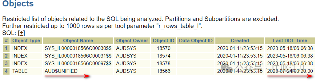 7)经过检查,与 AUD$UNIFIED 相关的 DDL 是审计记录清理操作,该操作每天00:20:00 自动调度,按天清理过期的审计数据,内部通过 DROP 分区实现,在该库上每次执行耗时50 秒左右