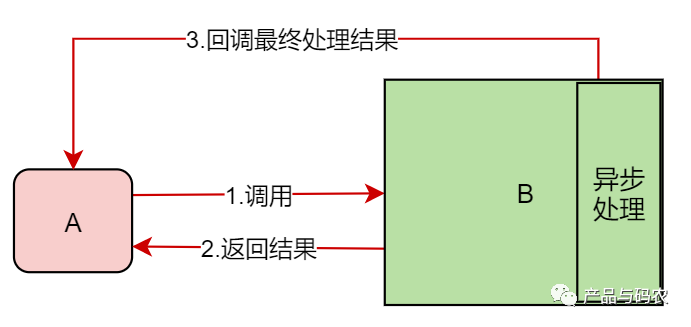 实际开发中,经常会碰到需要A服务调用B服务,B服务接收到请求返回调用成功,实际处理需要异步,当异步处理完成之后,再通知A,如下图: