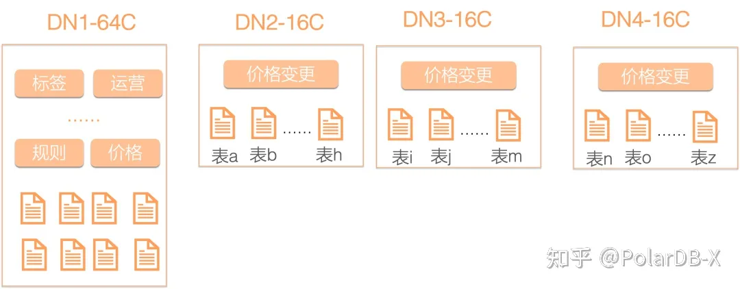 - 原始业务的多个单表,可以继续保持单表的形态,演进为分布式的垂直拆分,通过扩展单个存储池内的分布式节点后,可以实现多个单表在存储池多DN节点上的均衡分布。