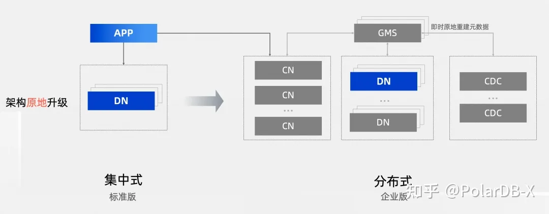 PolarDB分布式版跨形态的无缝升级切换,支持将集中式形态下的DN,逆向恢复为分布式下挂的DN节点(过程中需要构建分布式元数据、以及带DNS域名的一键切换),整个升级过程中原有集中式的数据不动,分钟级完成分布式的整体切换。