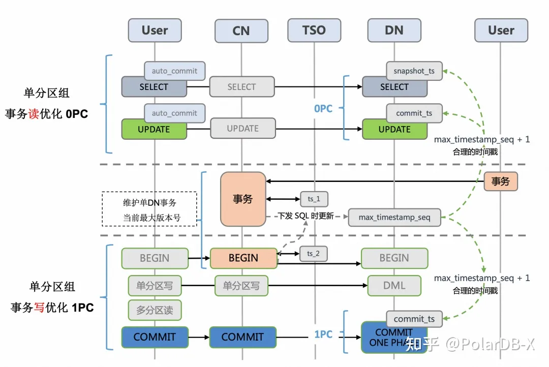- 针对autocommit=true的单分区读和写场景,可以利用单个DN节点的单机事务机制,可以减少通过GMS元数据获取GCN,与集中式相比并不会增加任何多余的网络请求,我们称之为事务 0 PC。